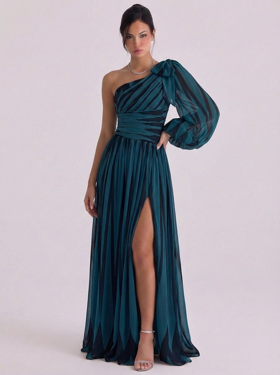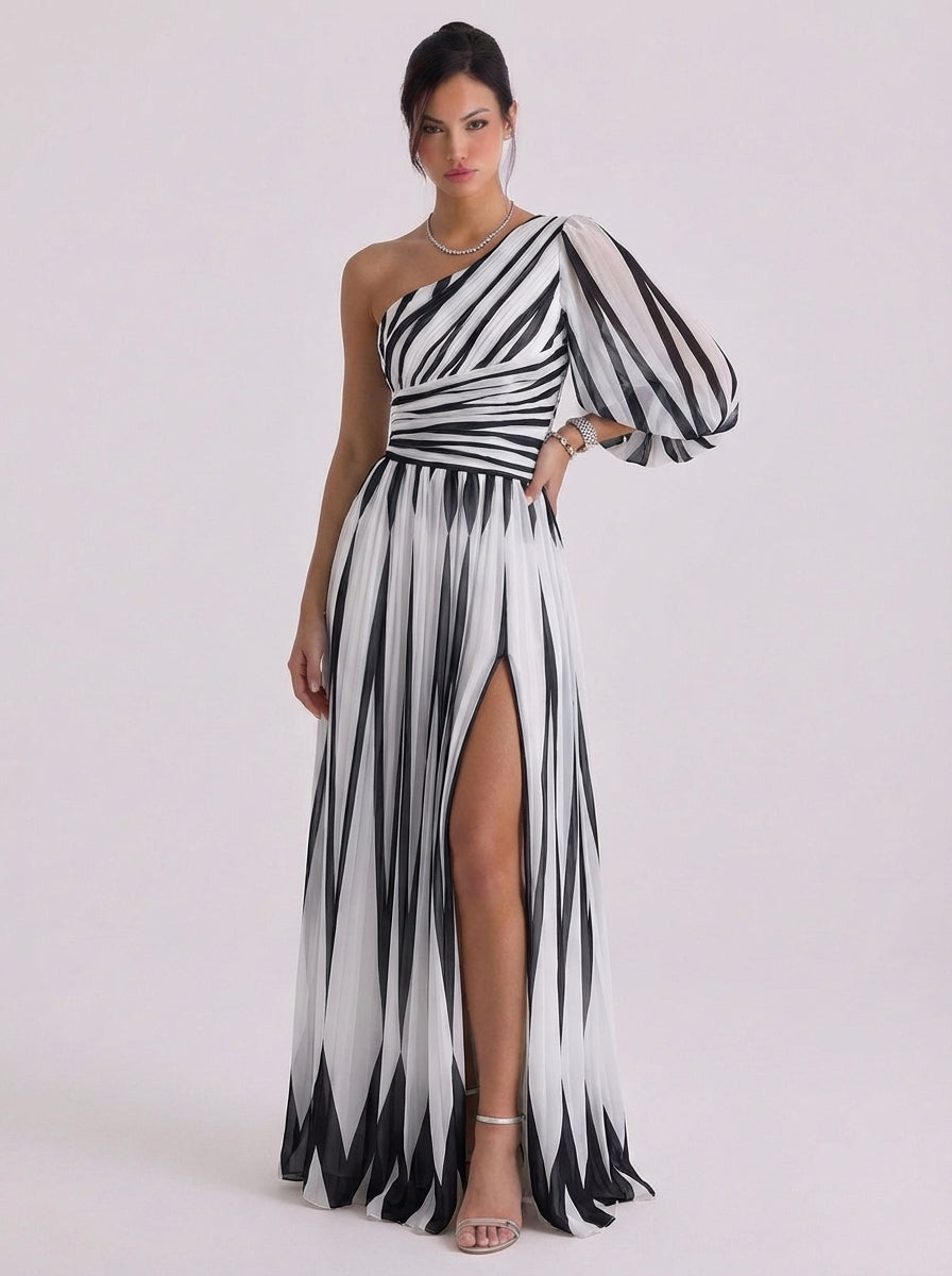 Abito monospalla con righe diagonali in chiffon, manica a palloncino, spacco alto