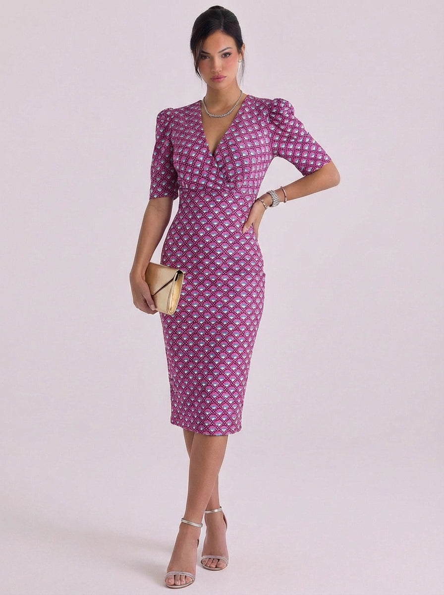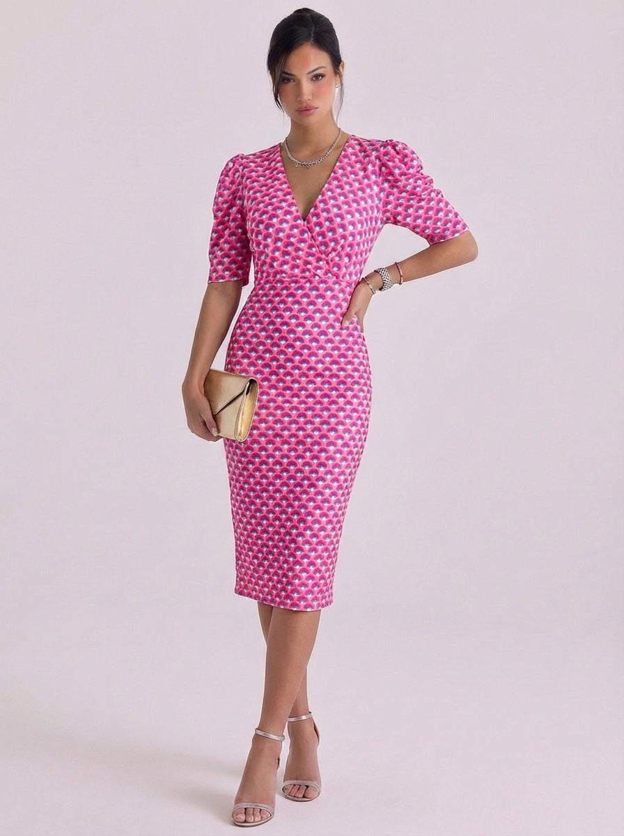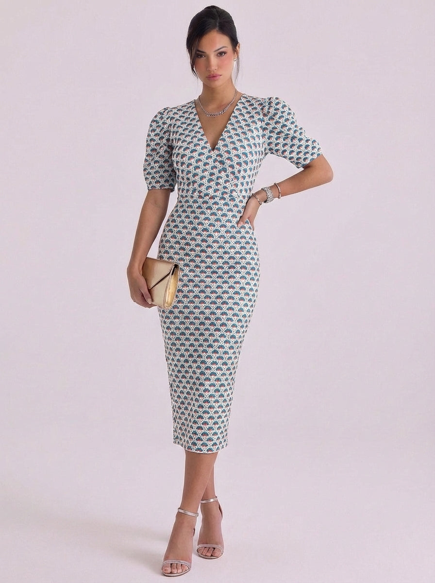 Abito midi stampato con maniche a sbuffo in cotone