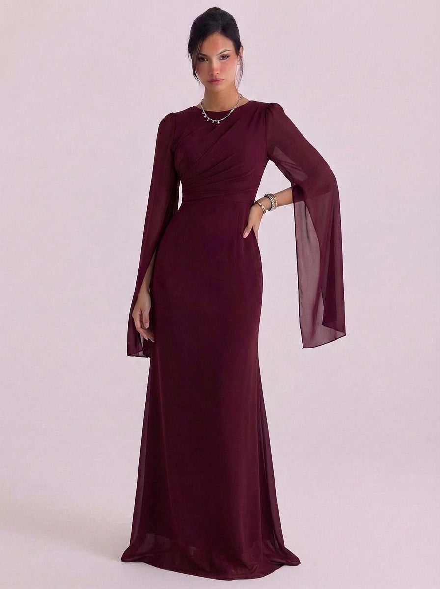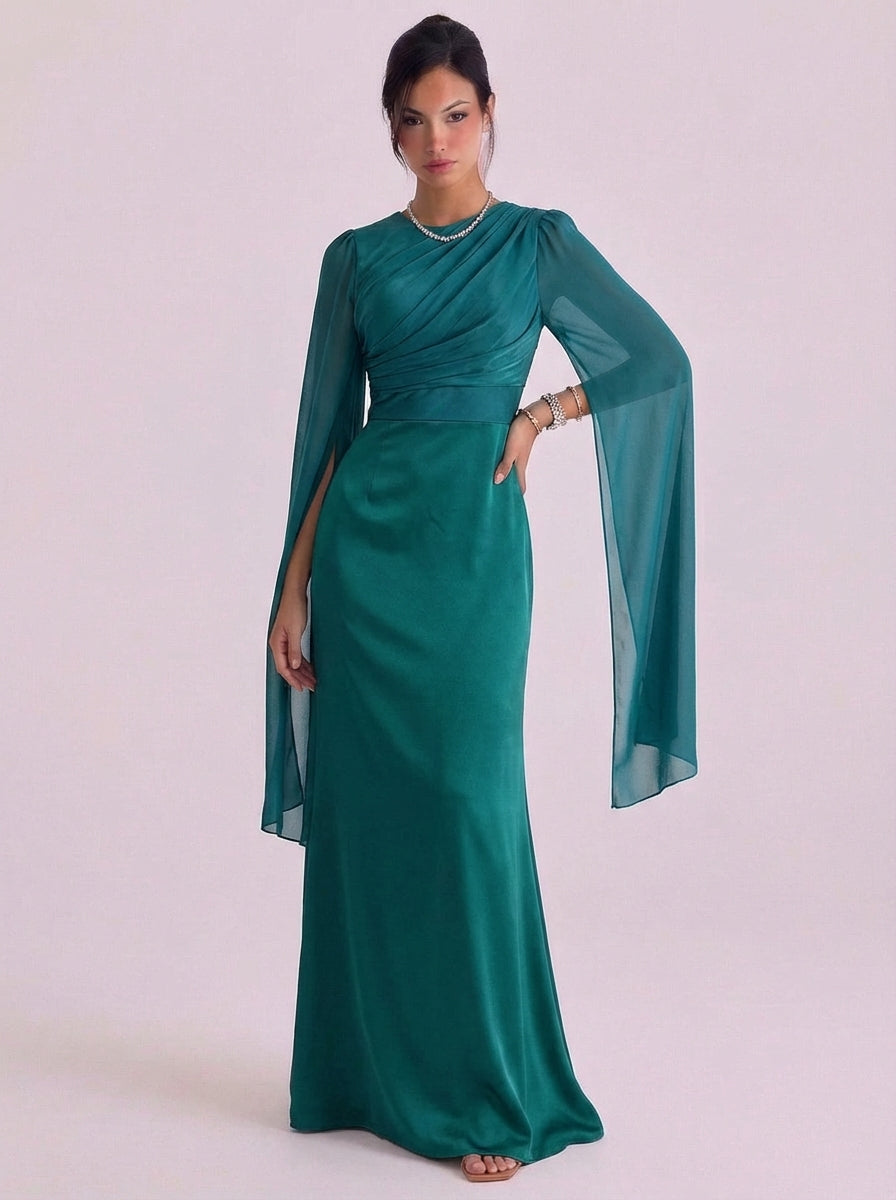 Abito in raso con maniche a campana, lunghezza fino al pavimento, aderente