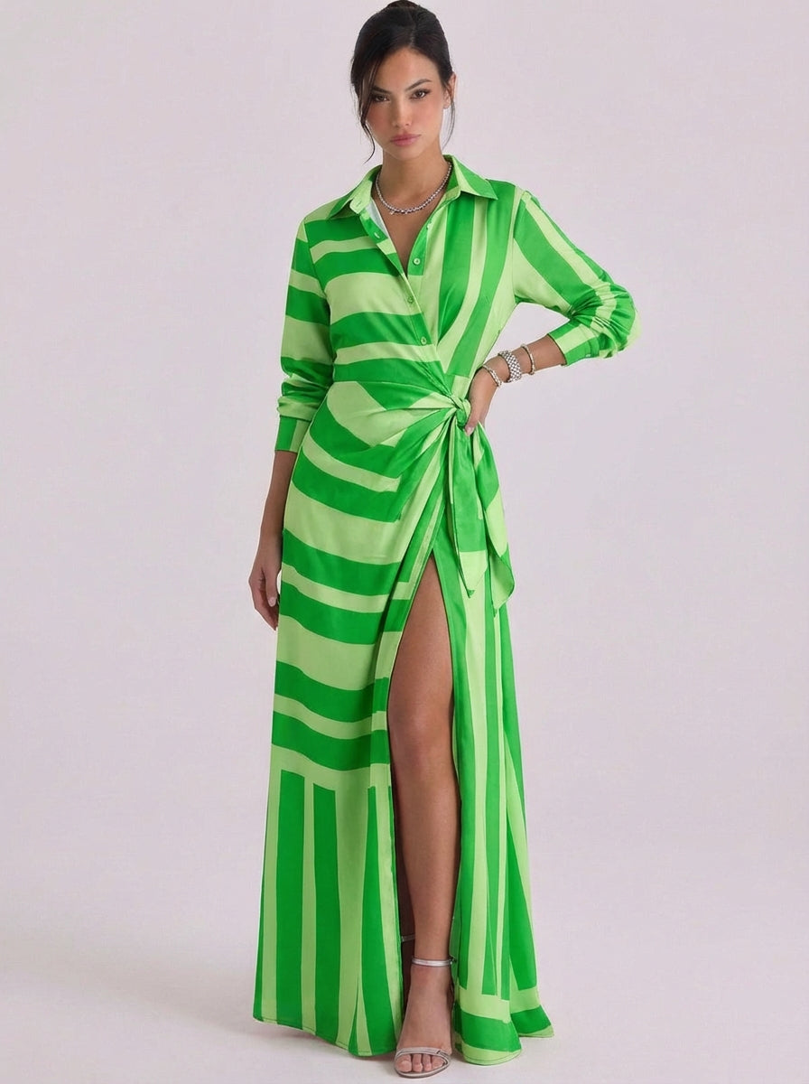 Abito lungo con colletto con stampa a righe in raso, abito lungo, manica lunga, spacco alto